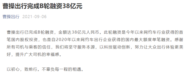 除了T3出行, 吉利旗下的曹操出行也是近来被资本青睐的网约车企业之一。9月6日,曹操出行拿到38亿元的B轮融资,且有消息称,其新一轮融资已在与投资商磋商中,可能会在2022年上半年完成。
