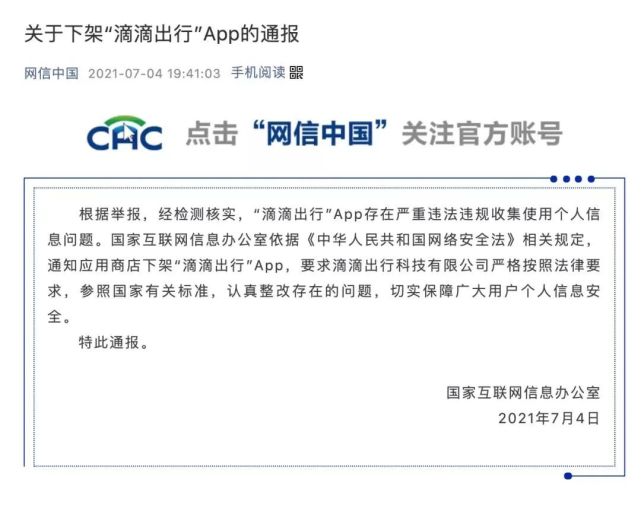 7月2日,网络安全审查办公室发布公告,为防范国家数据安全风险,维护国家安全,决定对滴滴出行启动网络安全审查,审查期间暂停注册新用户。7月4日, 国家网信办证实,滴滴出行App由于存在严重违法违规收集使用个人信息问题现已被下架。7月9日,国家网信办证实“滴滴企业版”等25款App被下架。