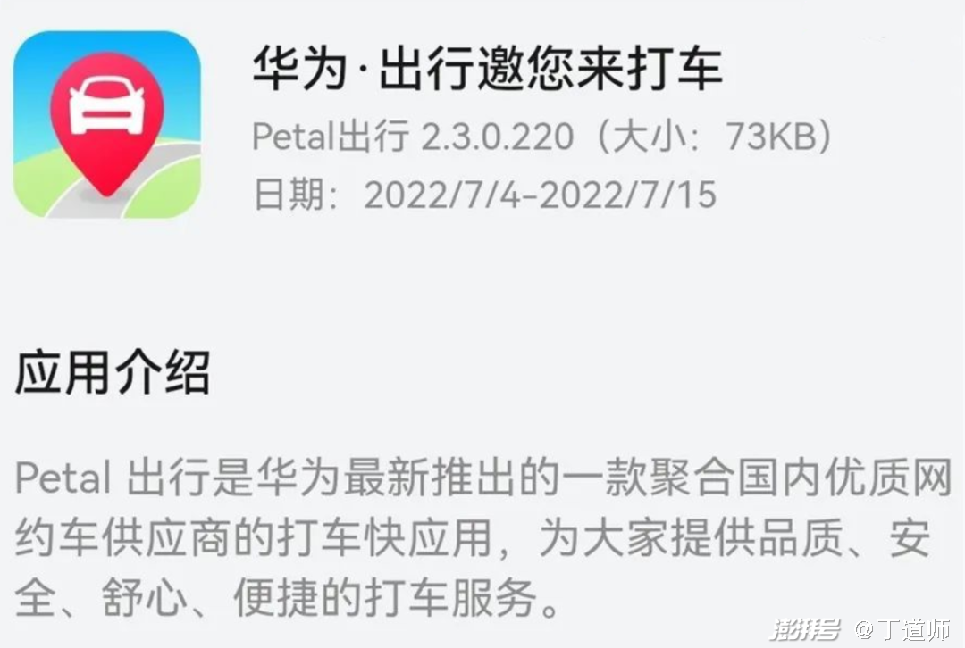 新闻二:2022年7月4日,华为面向众测用户推出“Petal 出行”打车软件,这款软件没有APP形态,采取了轻应用方式。目前,Petal出行现支持城市包括北京、深圳、南京3座城市,有神州专车和首汽约车两种可以选择。多家媒体报道,Petal出行采用地图的是华为的花瓣地图(Petal Maps)。