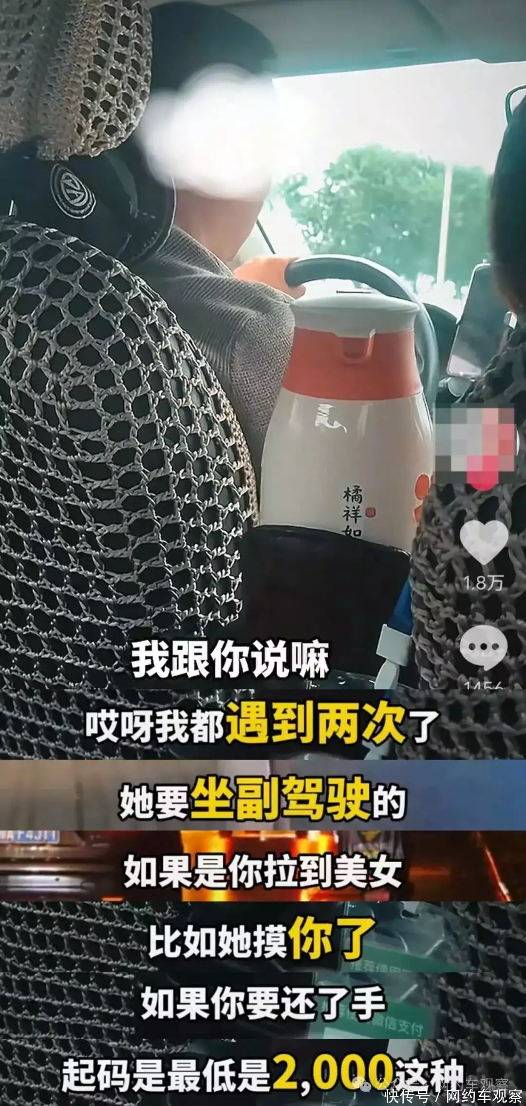 女乘客上了车主动和司机车谈笑风生,司机忍不住伸手过去,没想到一摸就是2000元,后面还跟着一辆车随时准备上来“讨说法”,让司机只能自认倒霉,以后再接到女性乘客,就把副驾锁起来不让坐了。